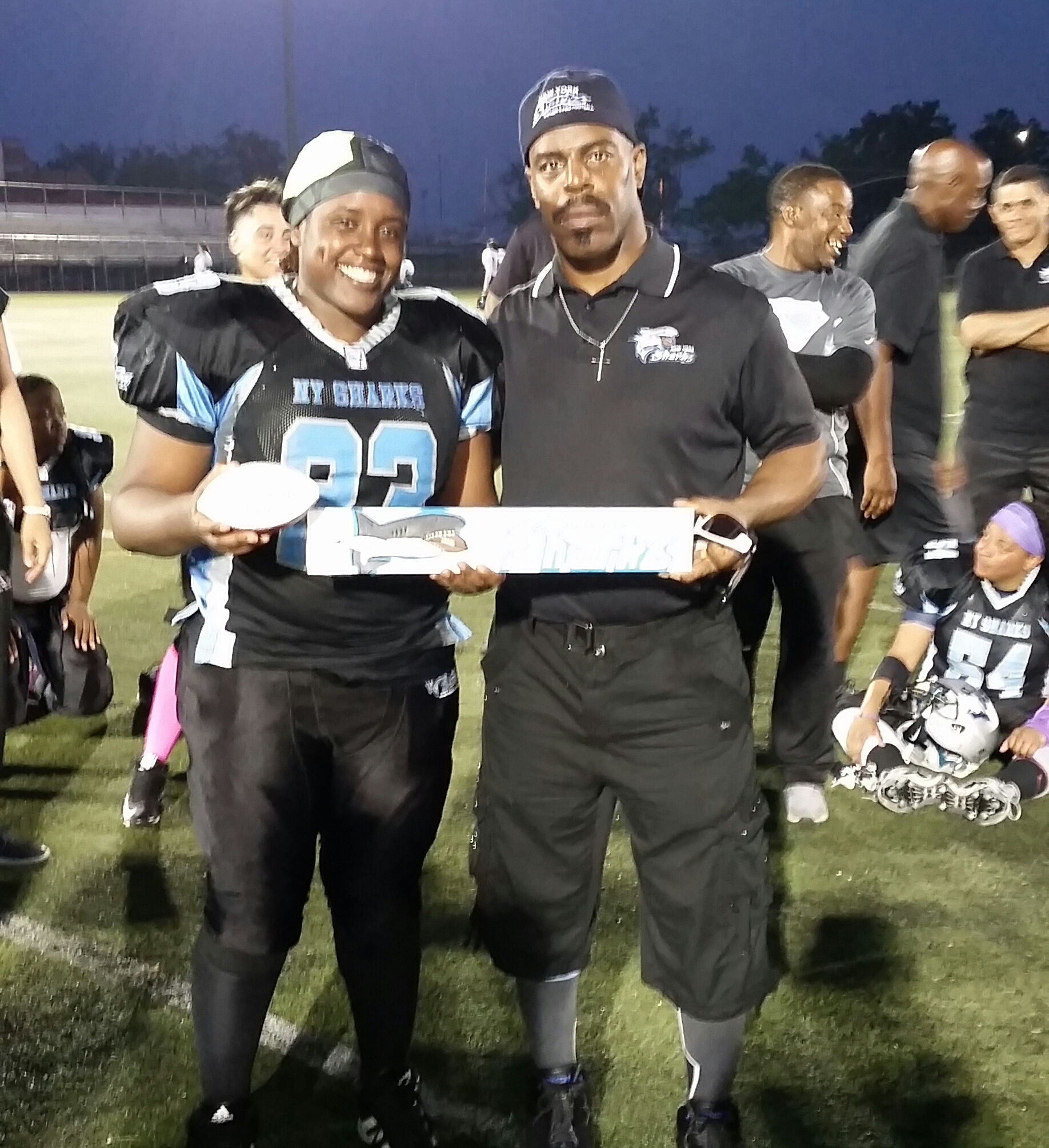 June 30, 2018, Brooklyn, NY WE DID IT!!! With amazing unity and focus, our Finned Ones put on a tremendous show for the awesome fans who turned out to support us in this 2nd round playoff game. Standout performances were had by players across the board in a thrilling game on a very warm evening at Aviator Sports and Events Center. Touchdowns, multiple turnovers, outstanding work by our offensive line and amazing play by the Sharks defense: It was a Very Good Night.