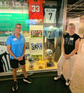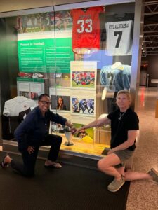 This past weekend, Andra Douglas (the Great White) made the trip to Canton. She was there to attend the Women’s Football Alliance National Championship games which were played in Tom Benson Memorial Stadium on the HOF campus. Congrats to the WFA and the all of the teams who played and to ultimate Champions of the All-American game, D3, D2, and Pro Divisions!! Andra walks the hallowed halls of the Hall of Fame museum each year during WFA championship weekend, but this time was special. This year, a heartwarming honor was bestowed upon the New York Sharks in an every evolving exhibit dedicated to Women in Football. This place is like a candy shop to Andra. She marveled at Larry Csonka’s jersey from the 1972 undefeated Miami Dolphins! Oh!…and Jim Brown’s cleats—no way! THE helmet from David Tyree’s “helmet catch” in the Super Bowl against the Patriots! And then…. just around a corner she came upon a sign that read, ‘WOMEN IN FOOTBALL.’ There it was, in a big display case—the NY Sharks represented with photos, the WPFL All-Star jersey she wore in the Orange Bowl, a game-worn jersey from 2000, signed by players, staff and coaches throughout the years, a pair of Shark logo-ed pants, and the helmet she wore when she played long ago. Andra would never have imagined the moment in which she found herself. (Pause. Deep Breath.) “All of the items on display are representative of the staff members and volunteers throughout our 20 seasons. Especially Crystal Turpin and Dana Sparling, along with Steve Mark and Merle Exit (we miss you Merlie Whirlie!) Without you, I would be writing this from a padded cell,” she says. 😂 ——- All in Andra’s own words from here on out ….. 🔊 “Thank you Fabian Alesandro and your unparalleled coaching staff who were at the helm for over a decade. WE couldn’t have done it without you. And, alas, to every player who swam into our ocean, YOU own a piece of this acknowledgment. We collectively – staff, coaches and players – accumulated many firsts in women’s tackle football and it is these firsts along with the dedication, fun and laughs, hard work, heartbreaks and joyous celebrations that merit this display. NY Sharks, every last one, YOU are so deservedly in the NFL Hall of Fame! P.S. Thank you to the Hall of Fame staff for this meaningful display: Ben Ankrum, Jon Kendle, Jason Aiken and Brad Collins. P.P.S. For every team that has suited up in Women’s Tackle Football; your countless stories, your determination, your endless heroics of suiting up and doing what we love—every bit of it is worthy of a HOF display! Don’t ever stop!” – A.D.💙🖤🦈 ———- Here’s a list of some NY Sharks firsts: Pioneers in Women’s Flag and Tackle Football since 1992. The New York Sharks Women’s Tackle Football Team was a perennial powerhouse in New York City from 1999 until the team was sold in 2018. They were arguably, the “winningest” and longest operating women’s tackle football team in the world. Known as front runners in the sport of women’s tackle football, the organization made great strides for women and girls in sports and held the respect of teams across the country. Here are some of their ‘firsts.’ • The Sharks were chosen by USA Football to represent the United States in the inaugural (2008) IFAF 5 on 5 Flag Football World Championships, held in Quebec, Canada. • Ten years later, they remained frontrunners in Women’s Tackle Football when they became the first team to travel internationally to the Inaugural 2018 Pro Cloud Tournament in Birmingham, England where they defeated the Helsinki Wolverines for the Championship title. • In addition to its on-field success, the team was the first women’s team to play in a halftime scrimmage inside an NFL stadium that was televised on January 2nd, 2005 in Giants Stadium, when “Big Blue” faced the Dallas Cowboys. • The Sharks produced and ran the first ever NFL Junior Player Development program for girls at the Giants practice facility in the spring of 2007. The event was so successful that it became an annual experience for girls in the greater NYC area. • In 2003, Sharks owner Andra Douglas started a not-for-profit 501 (c)3 organization called the “Fins Up Foundation for Female Athletics.” It was a ‘sister organization’ to the New York Sharks and the first of its kind to be established in women’s football. The mission of the Foundation is to provide opportunities for 8 -17 year-old “at-risk” girls to learn essential life skills through the sport of football from NY Shark players who coached the camps. • The Sharks were the first women’s team to make it into the Pro Football Hall of Fame in Canton, Ohio when their game ball was placed on display in 2008. • During their nineteen years of operation, it was the New York Sharks who were most widely covered by the media, having appeared on national shows including “American Gladiator,” ABC’s “The View” with Barbara Walters and “Live with Regis and Kathy Lee.” The team was featured on NBC Sports, in Sports Illustrated, on ESPN, and in Peter Jennings book “Search for America,” the Women’s Sports Foundation’s book “Superwomen” and the Smithsonian’s acclaimed book and exhibited entitled “Game Face: What does a Female Athlete Look Like.” The Sharks were featured regularly by both NYC Fox 5 and Brooklyn One each season. • The City of New York invited the team to city hall for a ceremony declaring August 9th, 2010 to be New York Sharks Day. • An award-winning documentary entitled “First Down” was produced which followed the Sharks during their very first season in 2000. • “Black & Blue: Love, Sports and the Art of Empowerment” was published in 2019, and is the first memoir-style book about women’s tackle football. The story is based on the New York Sharks and written by the owner and Women’s Football Hall of Fame member, Andra Douglas. C